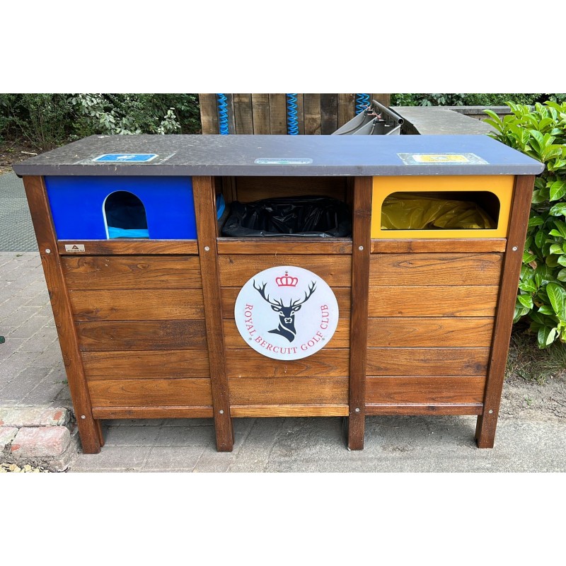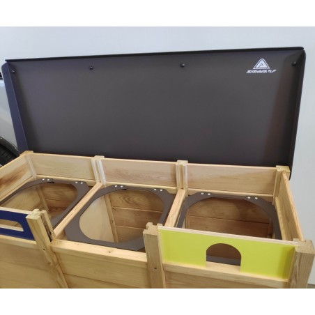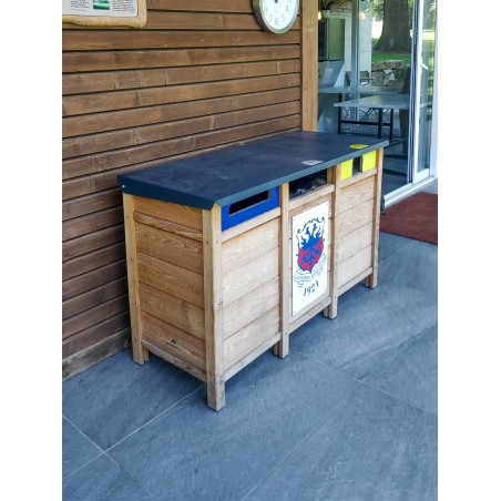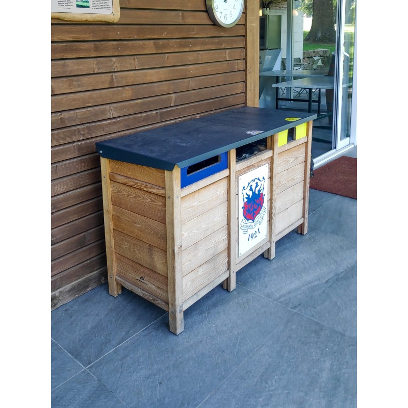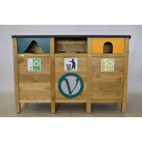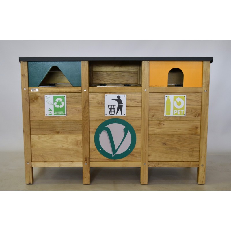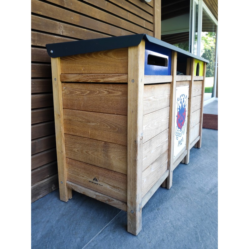 Fabrication : Structure fabriquée à base de Robinier Massif Français. Couvercle en acier avec protection anti corrosion et traitement peinture époxy RAL 7016 Gris anthracite. Fermoir et consignes de tri en face avant et sur le couvercle.