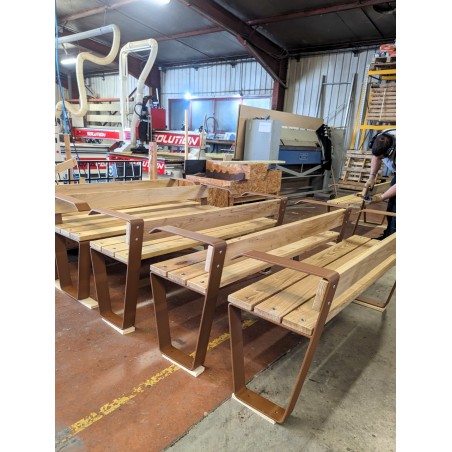 L'assise et dossier sont réalisées en Robinier ou Douglas massif (sciage local).