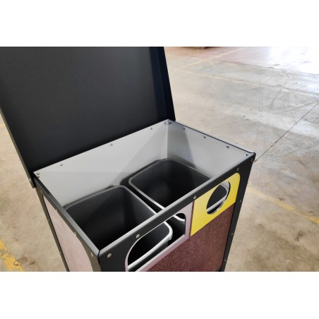 Objet : Bac de tri contemporain demandant peu d'entretien, composé de 2 compartiments de 45 litres avec consignes de tri sur le couvercle et usinage des trappes pour le tri.