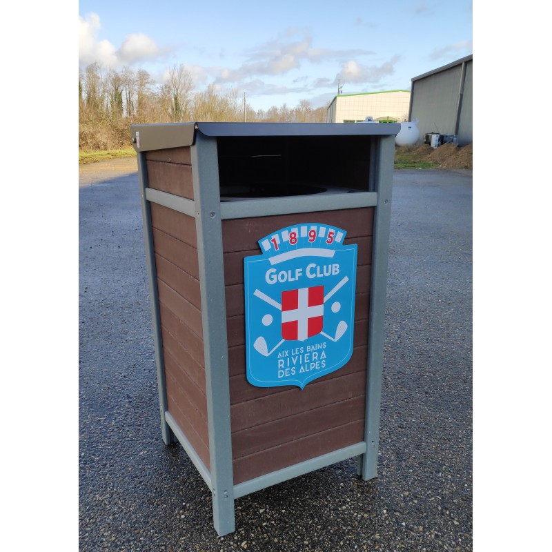 Objet : Poubelle d'extérieur d'un volume de 75 litres. Couvercle recouvrant et support sac intégré.Fabrication : Structure Noir et marron, éco conçue à base de plastique recyclé. Couvercle en acier avec protection anti-corrosion et traitement peinture époxy RAL 8019 Marron Brun. Support de sac intérieur sur charnières. Livré assemblé Format : Ht 900 x L 480 x l 480 mm
