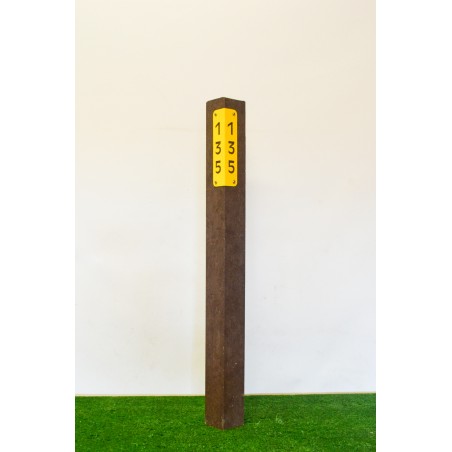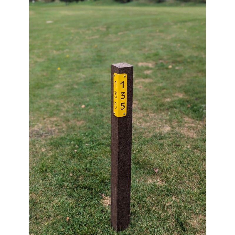 Objet : Repère de distance pour fairway très résistant et sans entretien.Fabrication : Poteau en plastique recyclé marron et plaque en aluminium ou inox peinte à l'époxy.Format : Poteau de 950 mm dont 750 mm hors sol. Section de 75 x 75 mm (tolérance de 2 mm environ).Plaque distance en L : L.58 x 58 x ht.160 mmFinition : époxy jaune (autre RAL possible en supplément)Couleur : à définir à la commandeOptions : Format, finition, fixation, gravure...Fourreau à la forme disponible pour 7.30 € HT.Tarif pour la commande de 24 unités ou plus d'une couleur.