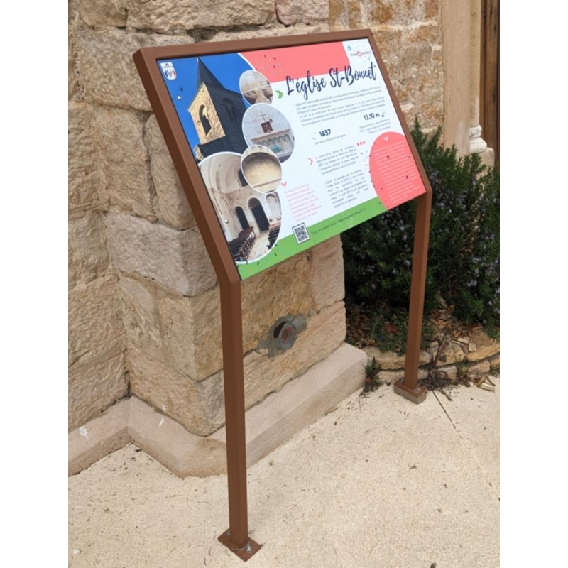 Objet : Panneau de départ de golf incliné pour afficher discrètement mais efficacement vos visuels de trou. Ce panneau peut accueillir un 2ème panneau si besoin (partenaire, rappel étiquette...).