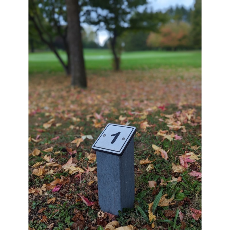 Fabrication : Poteau en plastique recyclé de 90 x 90 mm (pointe d’ancrage ou fourreau) et plaque gravée en Multidura, coloris et gravure à définir selon BAT.