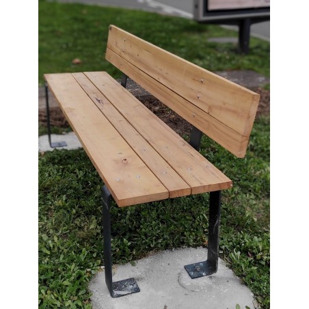 Format : Longueur 1500 mm x profondeur 450 mm x hauteur d’assise 420 mm x Ht. totale 700 mm. Finition : Primaire anti-corrosion et finition époxy (Ral à définir). Bois raboté, chanfreiné et saturateur monocouche ou huile. Options : lames en plastique recyclé marron, format, finition, coloris, fixation, gravure... Longueur 180 cm Tarif unitaire valable pour fabrication par 5 ou plus.