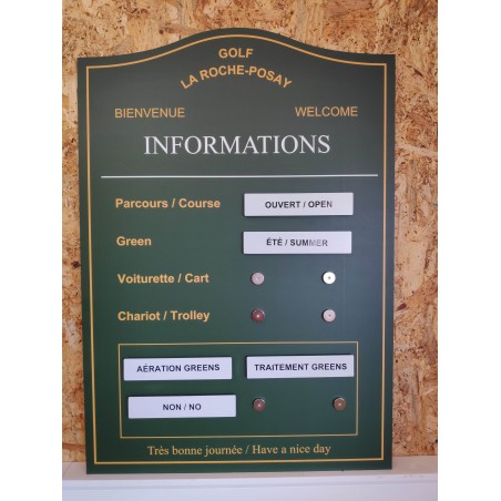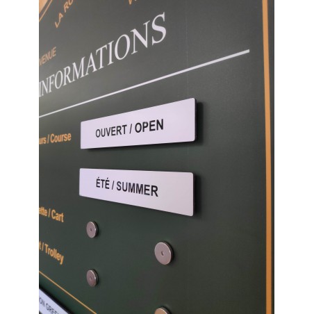 Fabrication sur mesure.Impression quadri sur vinyle avec contrecollage sur support aimantable.Fond aimantable ou mise en place d'aimants sur des zones dédiées.Finition : lamination UV brillante / mat.Largeur x Hauteur x Ep. mm