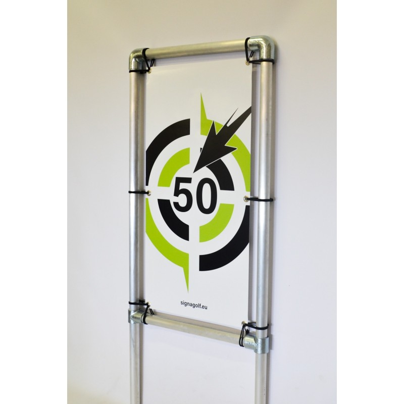Visuel en bâche PVC avec confection œillets et ourlets en pourtour pour mise en tension par boucles sandow. Vous pourrez facilement changer la bâche à l’avenir.