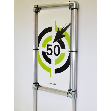 Visuel en bâche PVC avec confection œillets et ourlets en pourtour pour mise en tension par boucles sandow. Vous pourrez facilement changer la bâche à l’avenir.