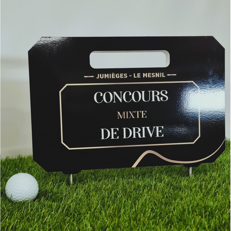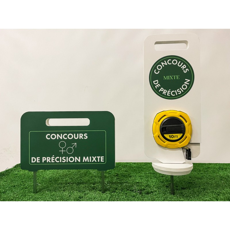 Objet : Panneau d'information Concours pour l'extérieur avec support marquage du type de concours sur une face. Poignée ergonomique et pointe d'ancrage. Il offre un bon compromis légèreté et résistance aux contraintes climatiques.Fabrication : PVC expansé avec faces lisses. Impression quadri sur vinyle polymère avec lamination anti UV mat.Pointe en acier zingué.Format : L.295 x Ht.195 mm + pointe.Options : Pastille adhésive avec votre logo ou visuels intégralement customisés.Habillage sur 2 faces.Tarif valable par 2 unités.