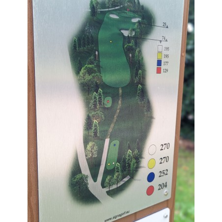 Objet : Panneau de départ finition aspect corten et visuel de trou imprimé sur alucomposite.